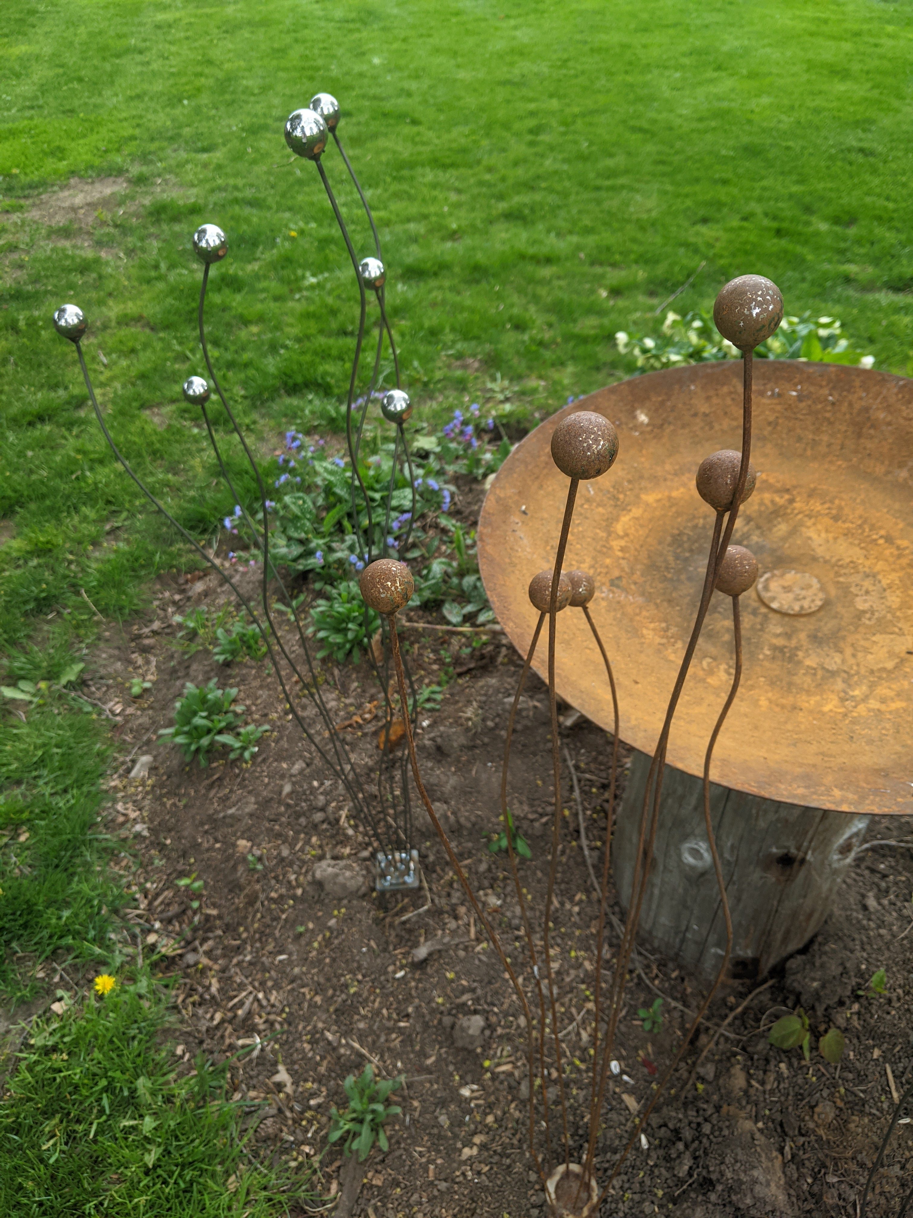 If the design sits on a stake (ex. Zen Circles) then 2 sturdy prongs measuring 10-12″ are welded to the bottom.