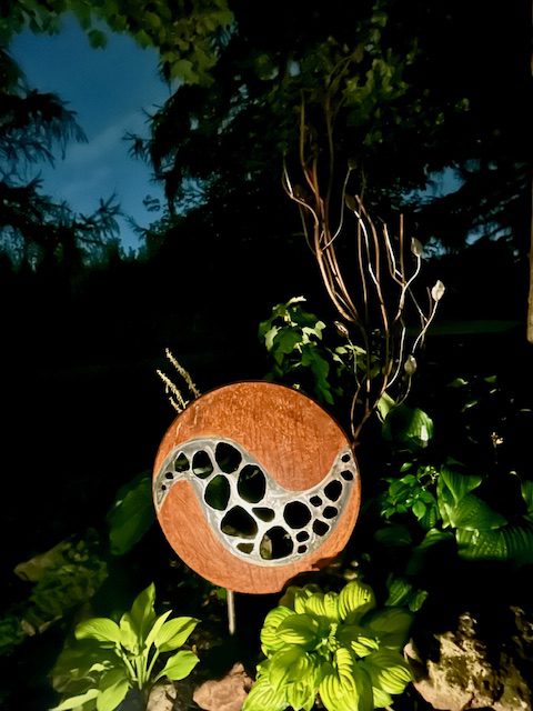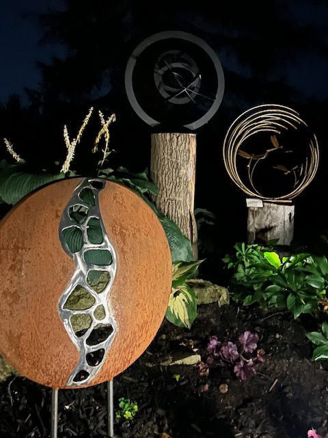 If the design sits on a stake (ex. Zen Circles) then 2 sturdy prongs measuring 10-12″ are welded to the bottom.