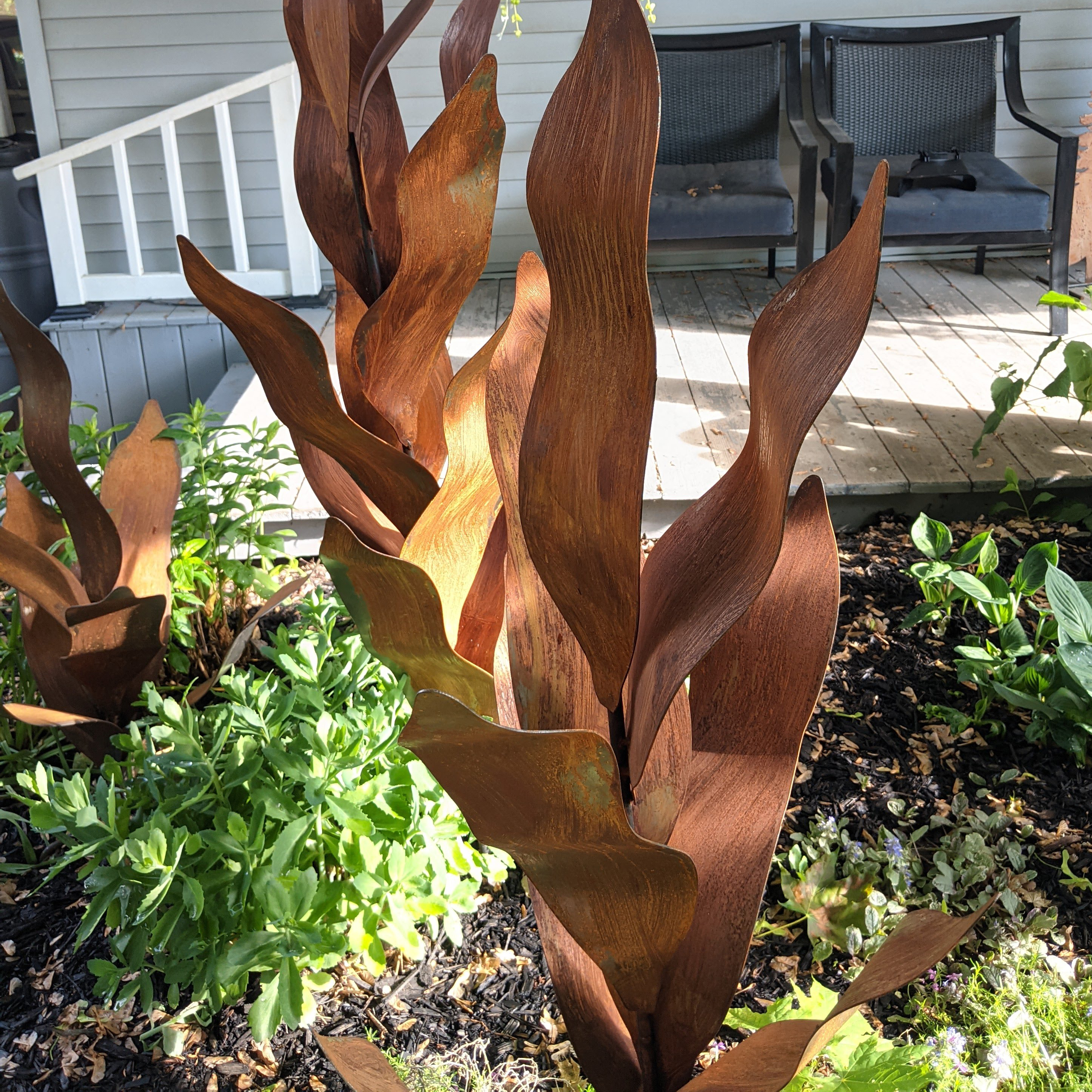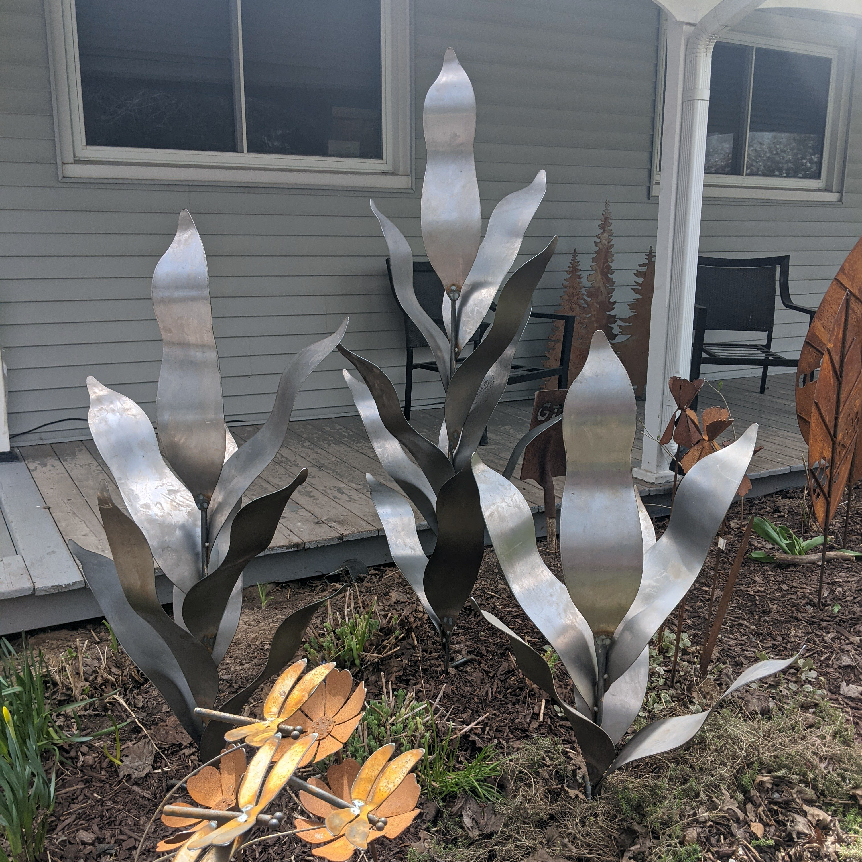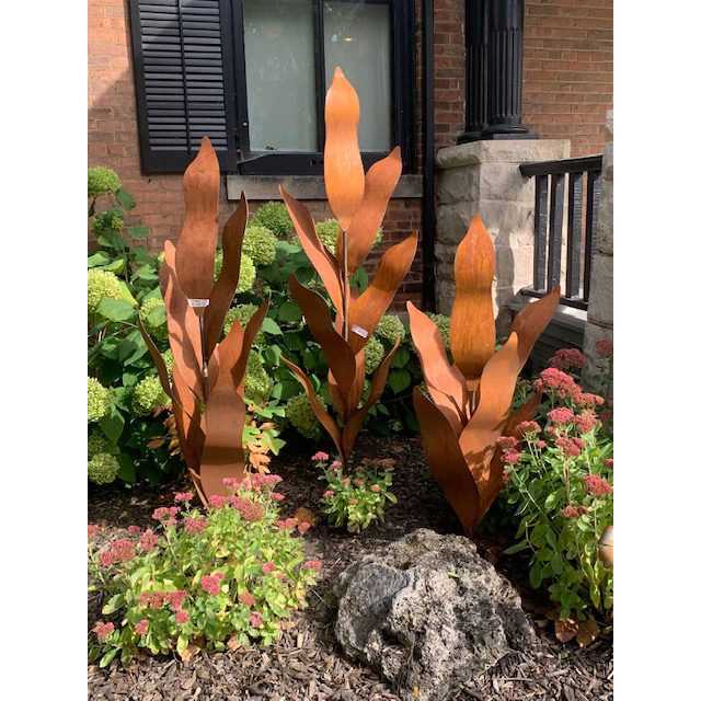 The wide leaves are cut from mild steel and bent by hand, creating the feeling of large plants unfurling from the Earth.