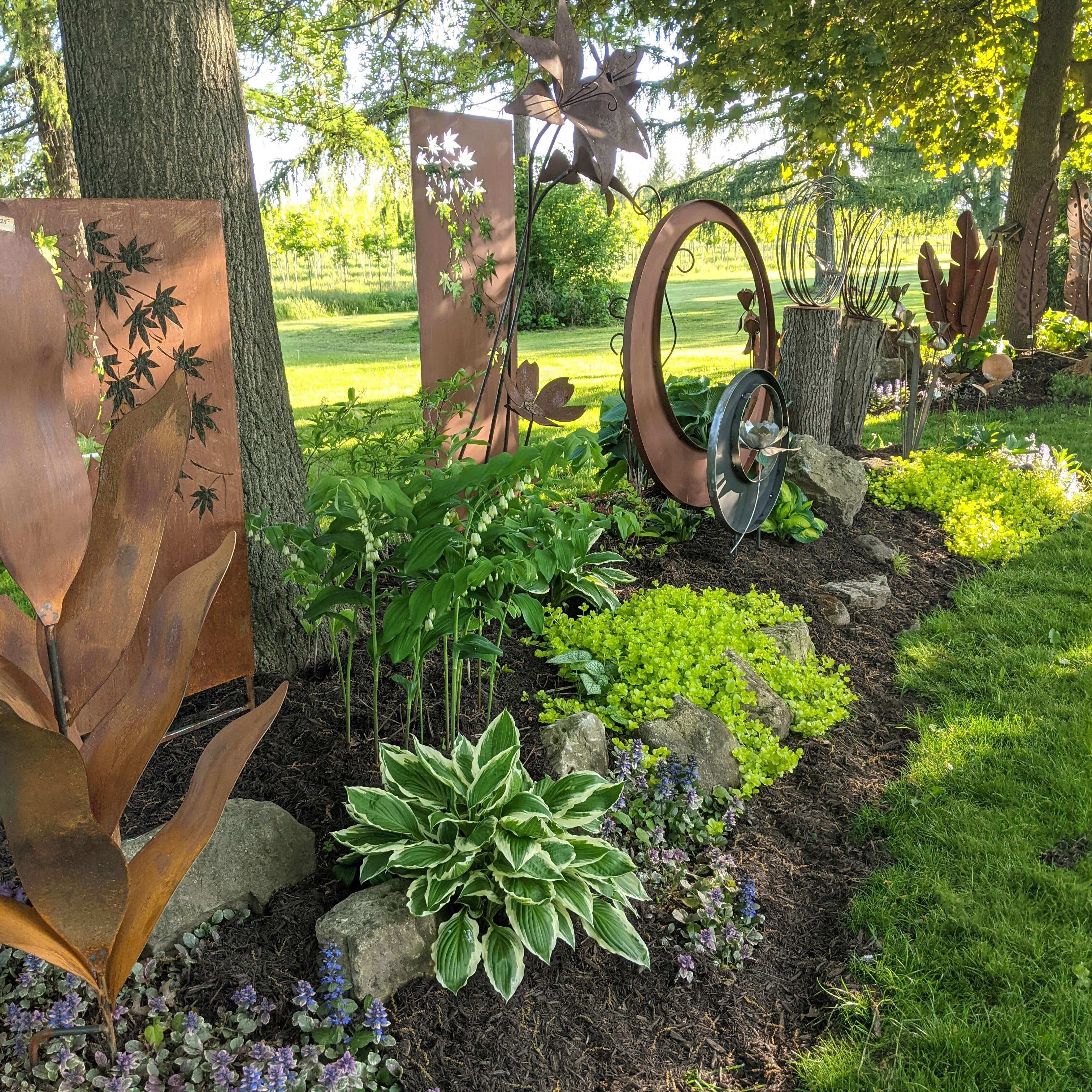 Create an evocative focal point for your garden by adding a set of matching metal sculptures.
