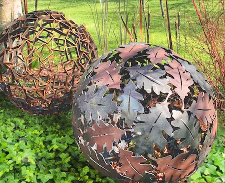 Introducing an exquisite blend of nature and craftsmanship: a 36″ tall handmade metal sculpture that is destined to become the centerpiece of any luxury landscape or interior space. This stunning work of art, inspired by the timeless beauty of oak leaves, features intricate cutouts and an organic spherical form that captures the essence of the outdoors with elegance and sophistication.
