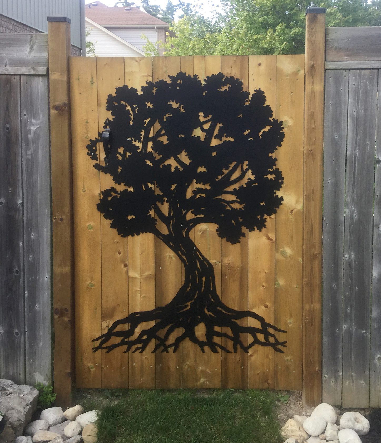 The Tree of Life is finished with professional black powder coating. It’s the perfect addition to a wooden gate, or the centerpiece of any indoor wall.